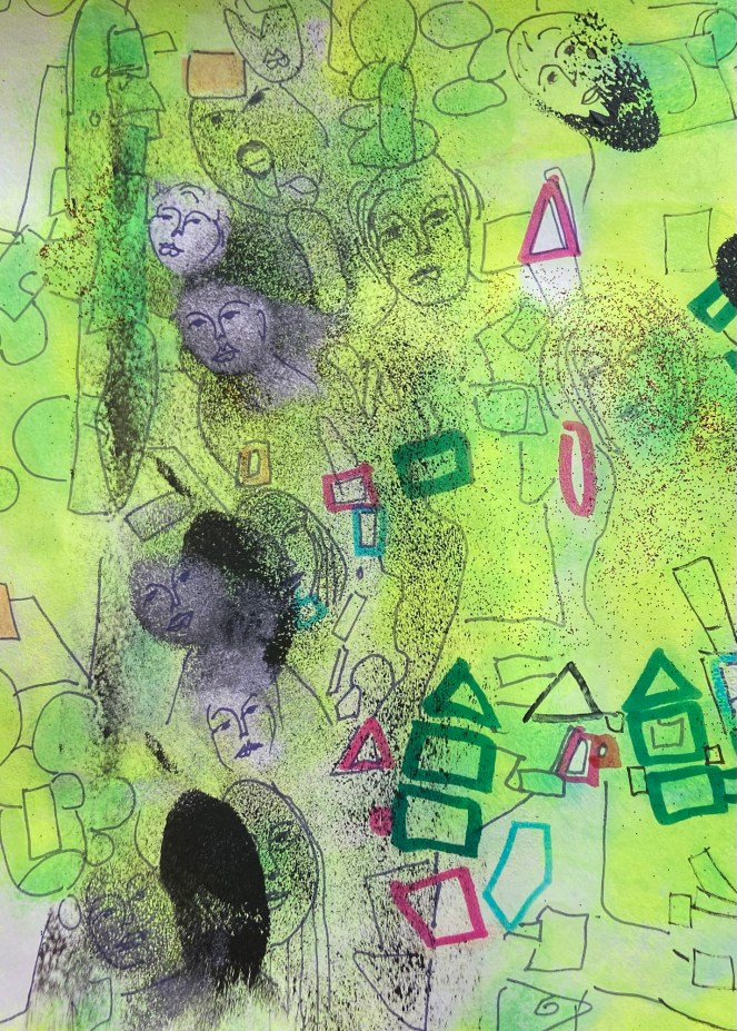 Grün und Gelb im Hintergrund, wie ein Lichtfeld, in dem sich die Figuren bewegen.