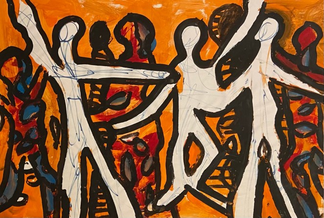 Unbeschriebene weiße Figuren in Bewegung, umgeben von dunklen Schatten – als ob sie sich aus Gewalt herauslösen, tanzen, widerstehen